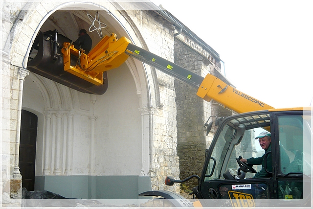 Un peu de minutie, pour ne pas endommager le célèbre porche classé de Senlis.